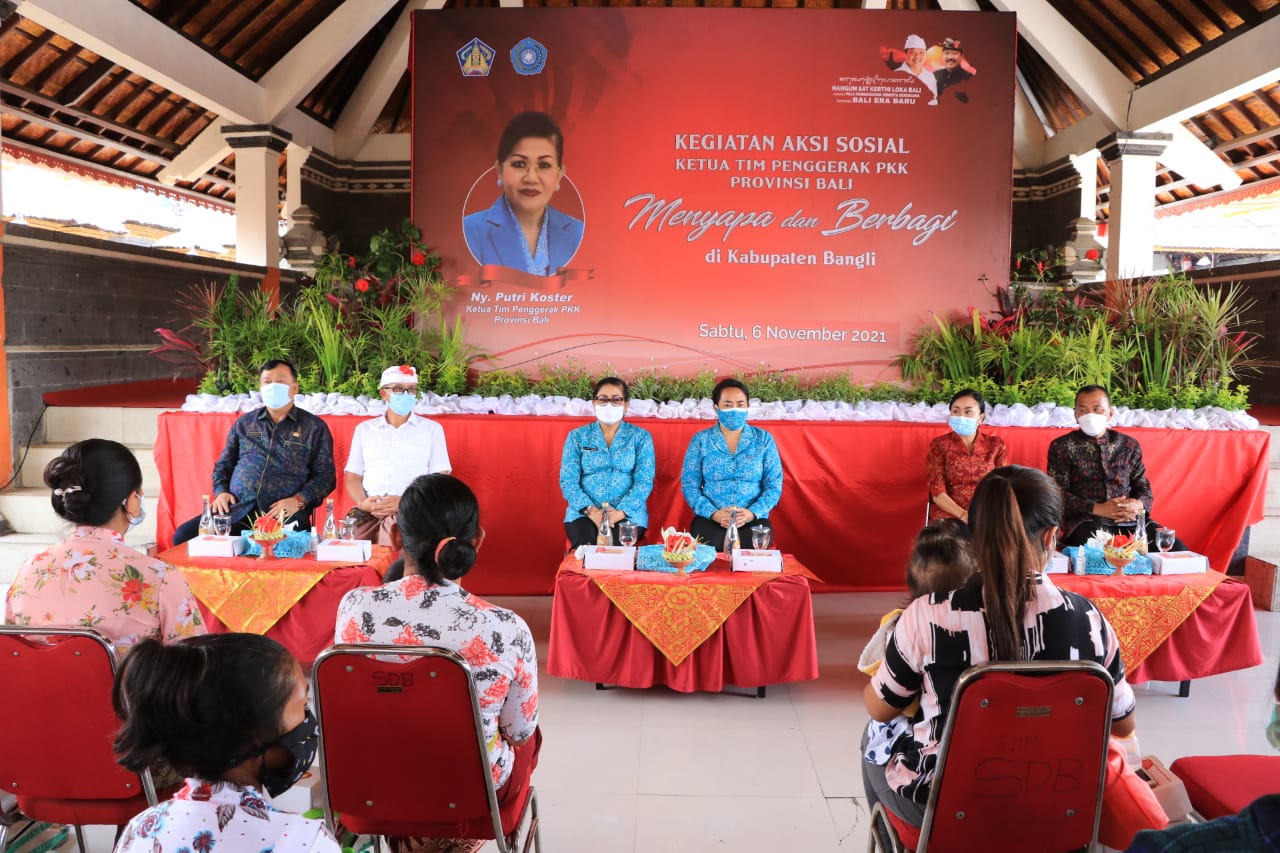 Ketua TP PKK Provinsi Bali Ny Putri Koster kembali turun ke tengah masyarakat. Kali ini, pendamping orang nomor satu di Bali menyapa dan berbagi dengan masyarakat Bangli yang dipusatkan di Wantilan Desa Kedisan, Kintamani, Bangli, Sabtu (6/11/2021).