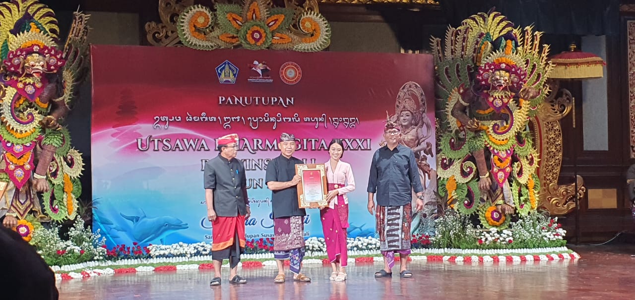 Piagam penghargaan para pemenang diserahkan oleh Kepala Dinas Kebudayaan (Kadisbud) Provinsi Bali, Prof. Dr. I Gede Arya Sugiartha mewakili Gubernur Bali pada penutupan UDG tahun 2023 di Gedung Kesirarnawa, Taman Budaya Bali, Kamis (7/9).