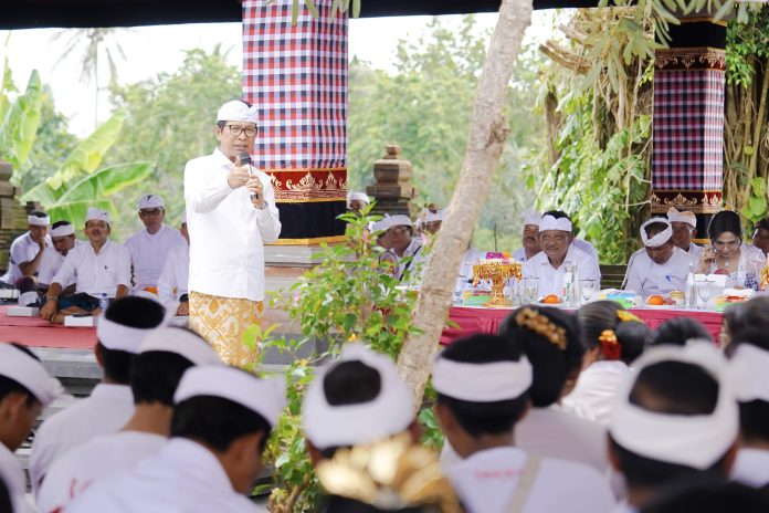 Bupati Badung I Wayan Adi Arnawa didampingi Ketua TP. PKK Kabupaten Badung Nyonya Rasniathi Adi Arnawa menghadiri upacara Mecaru Manca Kelud dan Melaspas di Pura Dalem, Banjar Tengah Kaler dan Kelod, Desa Gulingan, Mengwi, Rabu (9/4). Acara mecaru ini dipuput oleh Ida Bhujangga Rsi Mahawija Sri Sujati dari Griya Tangeb, Mengwi.
