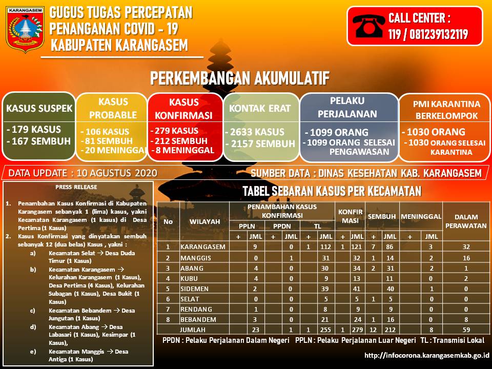 Berdasarkan update data dari Dinas Kesehatan Kabupaten Karangasem selaku Koordinator Satuan Tugas Bidang Kesehatan Gugus Tugas Percepatan Penanggulangan Covid 19 di Kabupaten Karangasem hari ini, Senin (10/08/2020).
