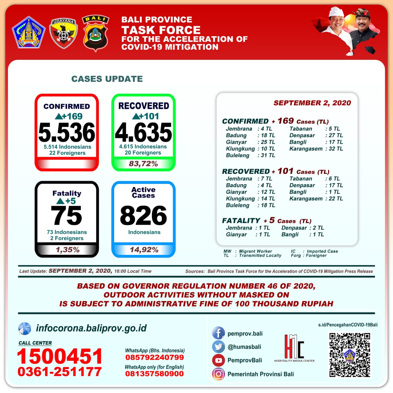 Perkembangan Pandemi Covid 19 di Provinsi Bali per hari ini mencatat pertambahan kasus TERKONFIRMASI sebanyak 169 orang melalui Transmisi Lokal, kasus SEMBUH sebanyak 101 orang, dan 5 pasien terkonfirmasi Meninggal Dunia.