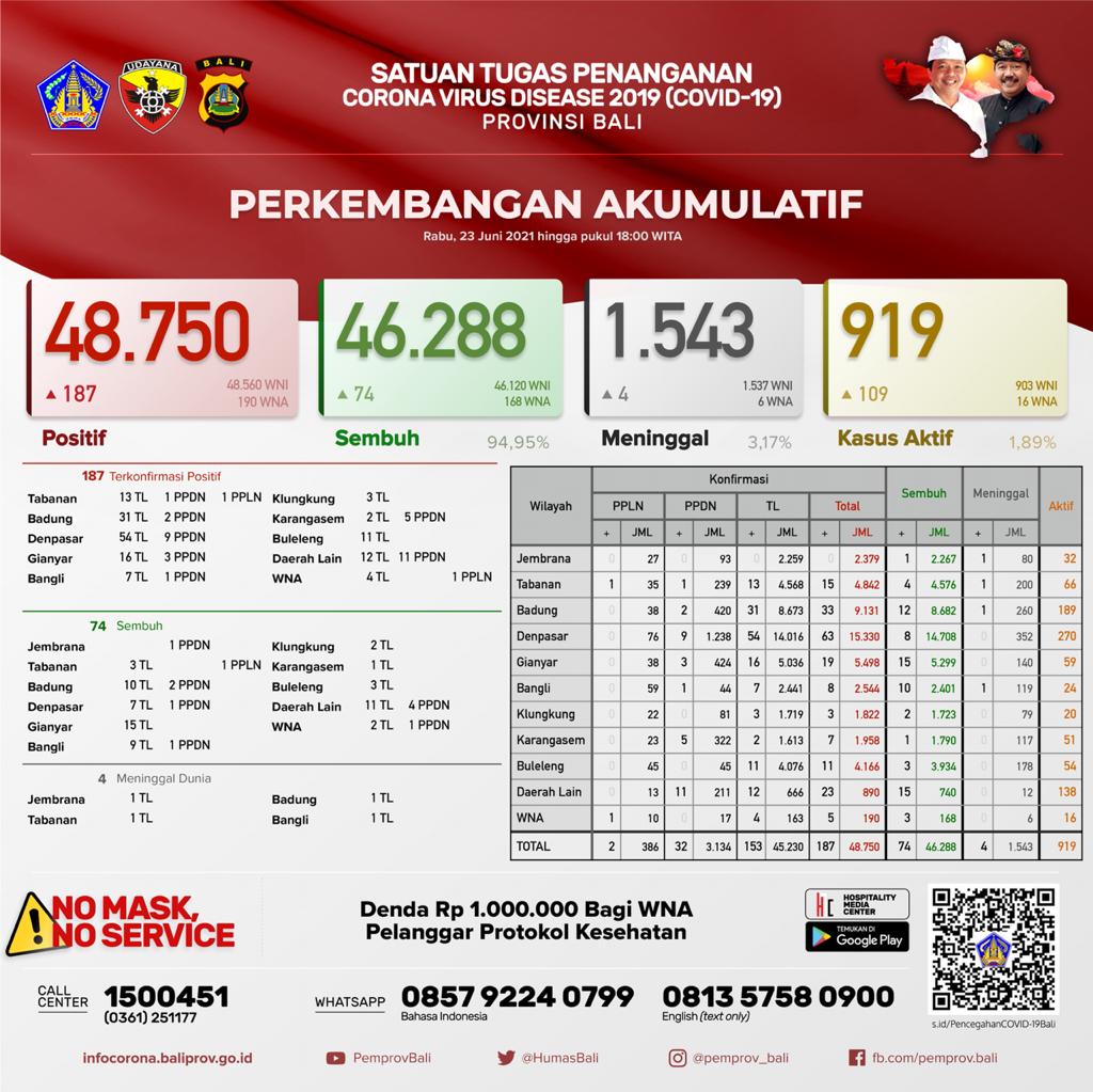 Pertambahan kasus hari ini sebagai berikut : TERKONFIRMASI sebanyak 187 orang (153 orang melalui Transmisi Lokal dan 32 PPDN dan 2 PPLN), SEMBUH sebanyak 74 orang dan 4 pasien meninggal dunia.