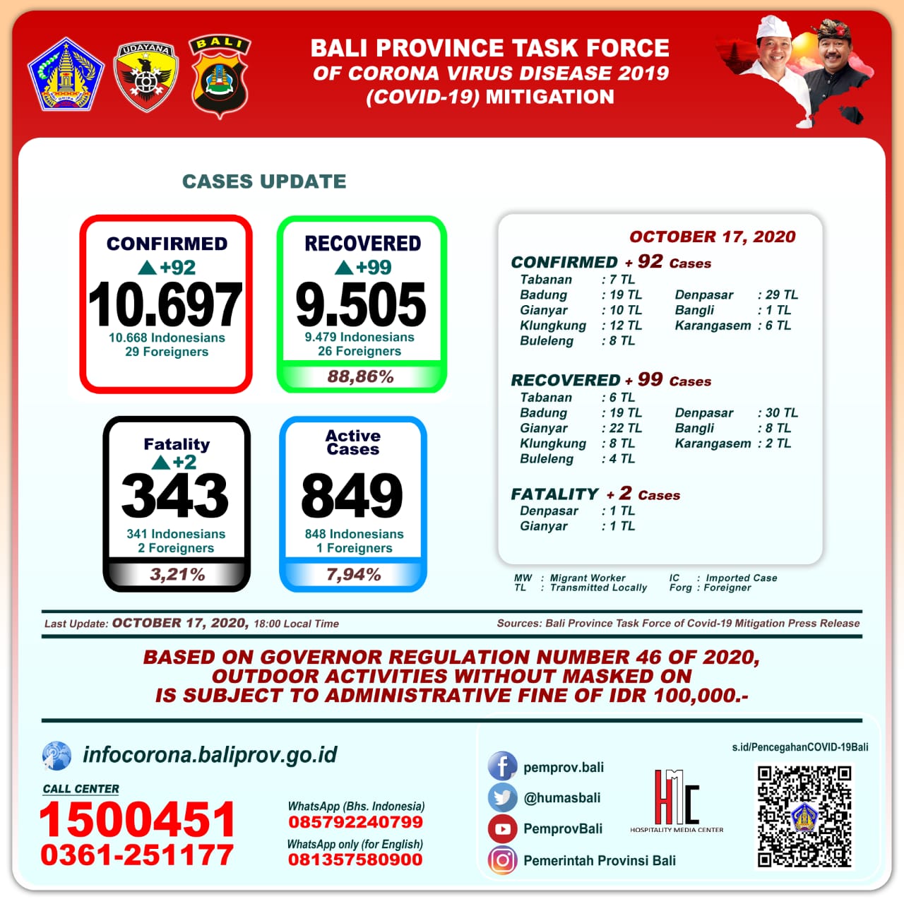 Sesuai Instruksi Presiden No. 6 Tahun 2020, Gubernur Bali mengeluarkan PERGUB No. 46 Tahun 2020, yang mengatur tentang Sanksi Administratif bagi pelanggar Protokol Kesehatan. Besaran denda yg diterapkan adalah Rp. 100.000,- bagi perorangan, dan Rp. 1.000.000,- bagi pelaku usaha dan tempat fasilitas umum lainnya.