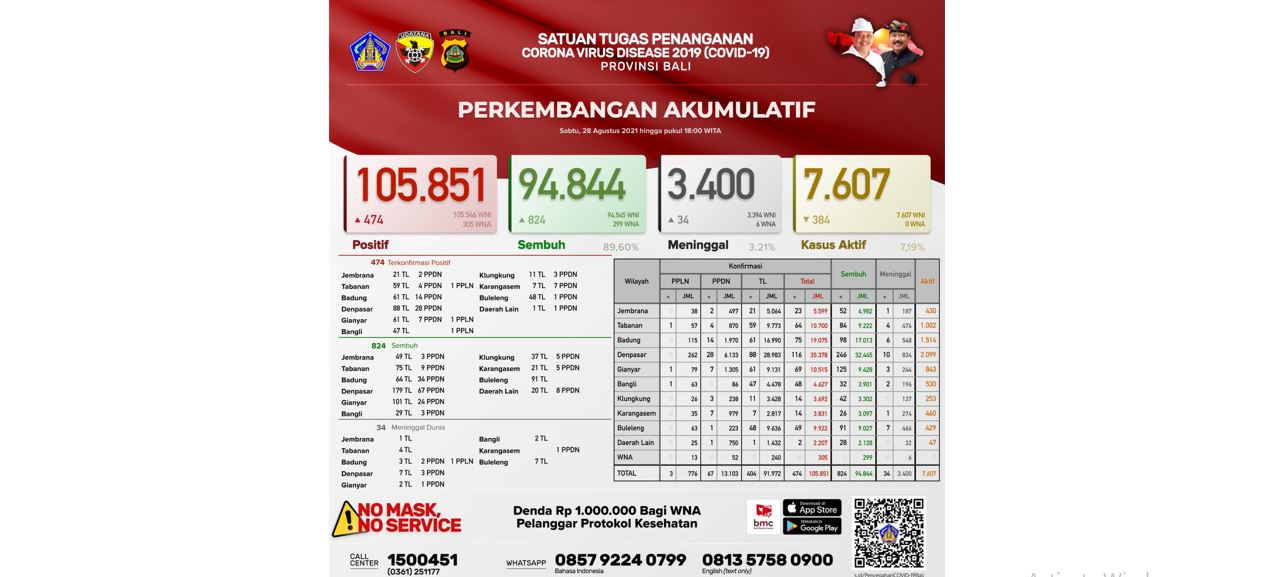 TERKONFIRMASI 105.851 orang, SEMBUH 94.844 orang (89,60%), dan Meninggal Dunia 3.400 orang (3,21%).