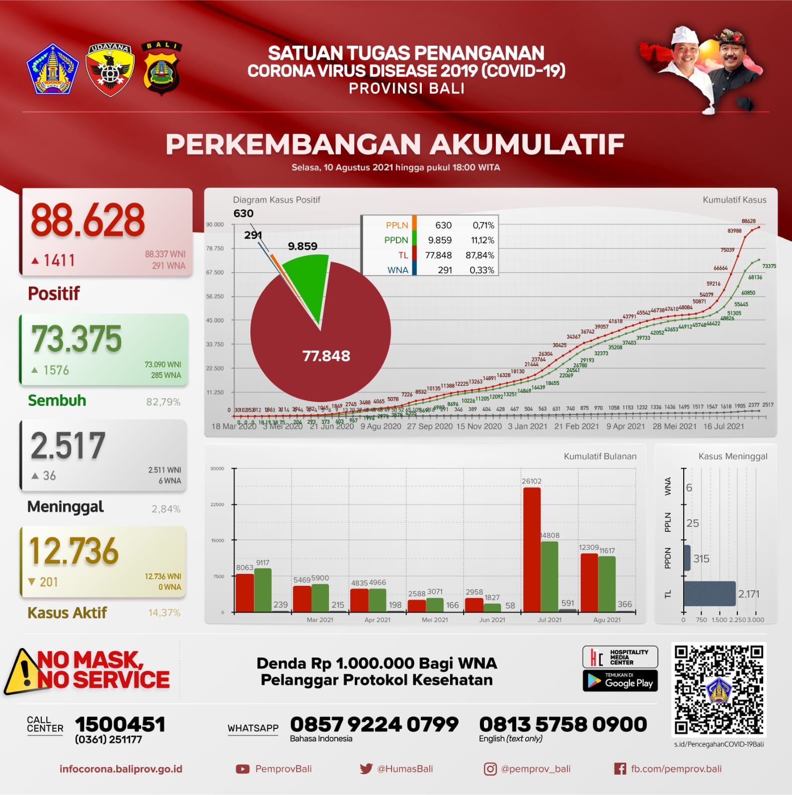 Jumlah kasus secara kumulatif sebagai berikut :  TERKONFIRMASI  88.628 orang, SEMBUH 73.375 orang (82,79%), dan  Meninggal Dunia 2.517 orang (2,84%). Kasus Aktif per hari ini menjadi 12.736 orang (14,37%).