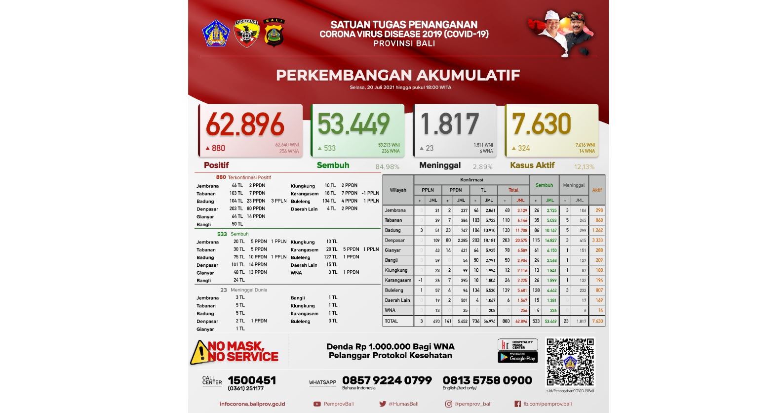 Jumlah kasus secara kumulatif sebagai berikut : TERKONFIRMASI 62.896 orang, SEMBUH 53.449 orang (84,98%), dan Meninggal Dunia 1.817 orang (2,89%). Kasus Aktif per hari ini menjadi 7.630 orang (12,13%).