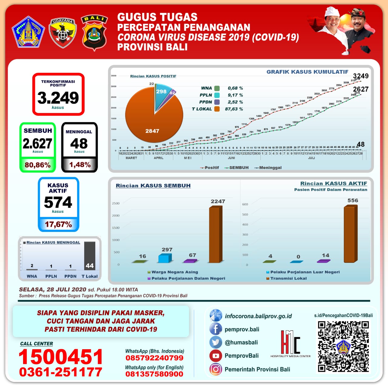 Gugus Tugas Percepatan Penanganan COVID-19 Provinsi Bali menyampaikan perkembangan Penanganan Corona Virus Disease (COVID-19) di Provinsi Bali per Selasa (28/7), Jumlah kumulatif pasien positif 3.249 (bertambah 30 transmisi lokal).