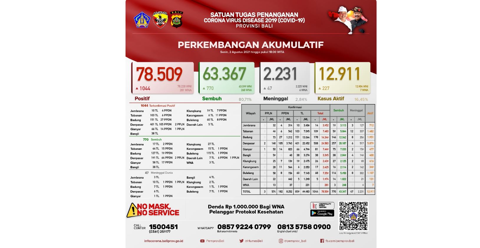 Jumlah kasus secara kumulatif sebagai berikut : TERKONFIRMASI 78.509 orang, SEMBUH 63.367 orang (80,71%), dan Meninggal Dunia 2.231 orang (2,84%). Kasus Aktif per hari ini menjadi 12.911 orang (16,45%).