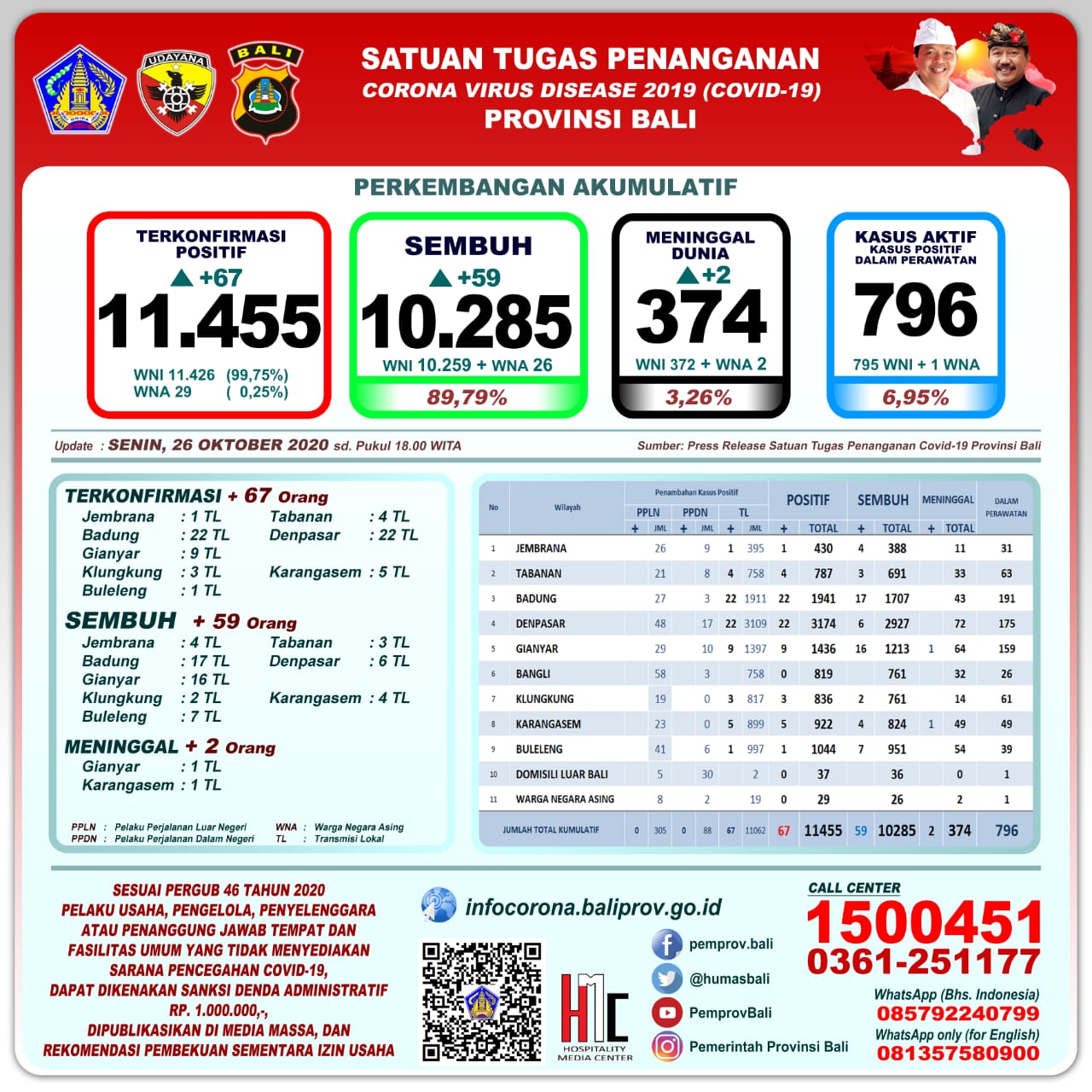 Sesuai Instruksi Presiden No. 6 Tahun 2020, Gubernur Bali mengeluarkan PERGUB No. 46 Tahun 2020, yang mengatur tentang Sanksi Administratif bagi pelanggar Protokol Kesehatan. Besaran denda yg diterapkan adalah Rp. 100.000,- bagi perorangan, dan Rp. 1.000.000,- bagi pelaku usaha dan tempat fasilitas umum lainnya.