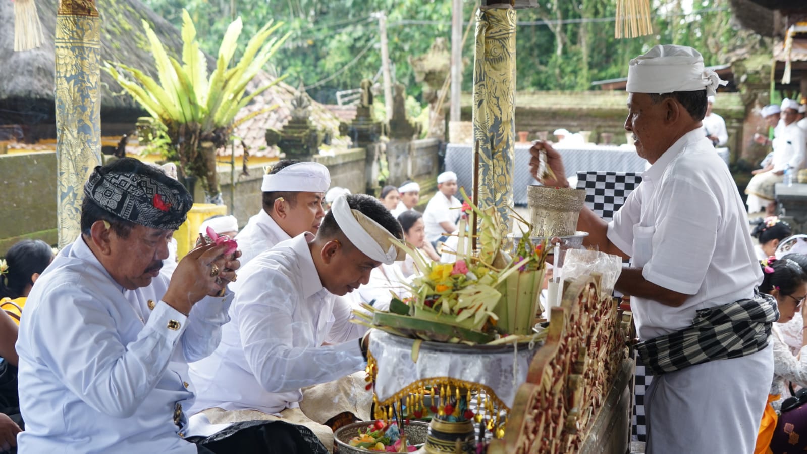 Wakil Bupati (Wabup) Jembrana IGN Patriana Krisna (Ipat) muspayang bhakti penganyar di Pura Luhur Pucak Petali Desa Jatiluwih, Kecamatan Penebel, Kabupaten Tabanan, Jumat (21/4). Nampak hadir pula Wagub Bali Tjokorda Oka Artha Ardana Sukawati serta seluruh pemedek.