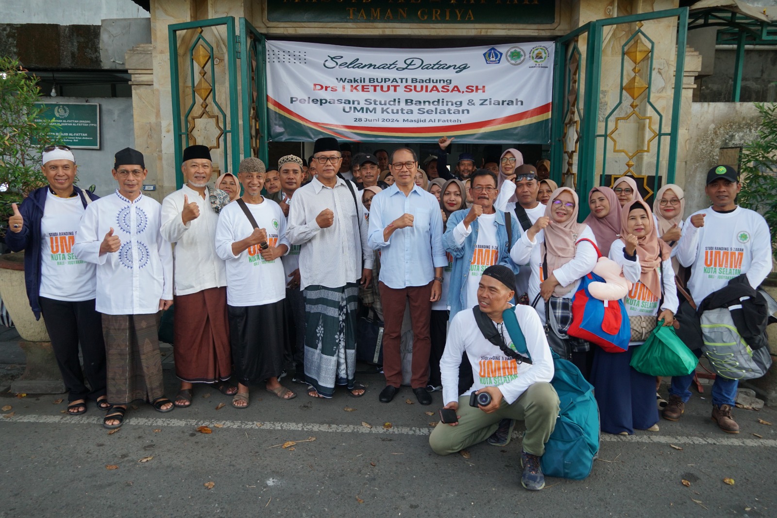 Wakil Bupati Badung I Ketut Suiasa melepas Studi banding dan Ziarah di Masjid Al Fattah, Taman Griya Desa Adat Jimbaran, Kecamatan Kuta Selatan, Jumat (28/6). Kegiatan Studi Banding dan Ziarah ini dilaksanakan dari tanggal 28 Juni-1 Juli 2024 dengan tujuan Masjid Jogokariyan Yogyakarta dan Masjid lainnya yang berada di Yogyakarta. Wakil Bupati Badung I Ketut Suiasa juga memberikan dana pribadi sebesar Rp 6 juta yang langsung diterima oleh Satrio Wibowo selaku Ketua UMM Kuta Selatan yang langsung disaksikan oleh seluruh pengurus dan peserta rombongan studi banding dan ziarah ke Yogyakarta.