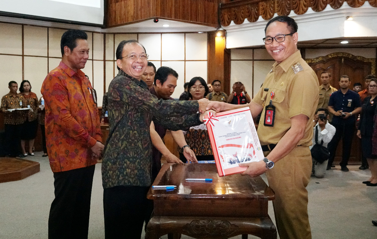 Wakil Bupati Badung I Ketut Suiasa menerima Daftar Isian Pelaksanaan Anggaran (DIPA), Anggaran Pendapatan dan Belanja Nasional (APBN) Tahun Anggaran 2020. DIPA diserahkan Gubernur Bali, I Wayan Koster di Gedung Wiswa Shaba Utama, Kantor Gubernur Bali, Selasa (19/11). DIPA APBN 2020 diterima seluruh Kabupaten/Kota di Bali dan 19 Satuan Kerja. Penyerahan dihadiri Kakanwil Ditjen Perbendaharaan Provinsi Bali, Tri Budhianto, Forum Pimpinan Daerah Provinsi Bali dan Bupati/Walikota se-Bali. Khusus untuk dana transfer ke daerah dan dana desa tahun 2020, Kabupaten Badung menerima Rp. 0,738 trilyun, meningkat 0,362 miliar dibanding tahun 2019.