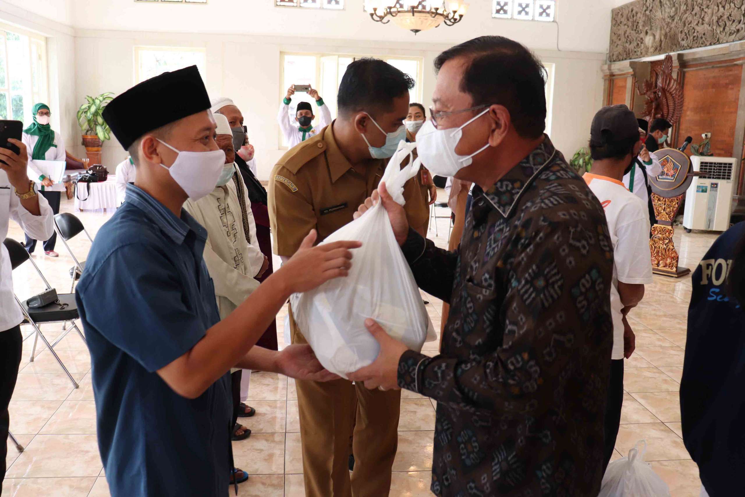 Wakil Bupati Buleleng I Nyoman Sutjidra menyerahkan bantuan sembako secara simbolis dari Badan Amil Zakat Nasional (Baznas) Buleleng kepada sepuluh orang penerima. Wabup Sutjidra menyerahkan paket sembako dalam rangka Safari Ramadhan.