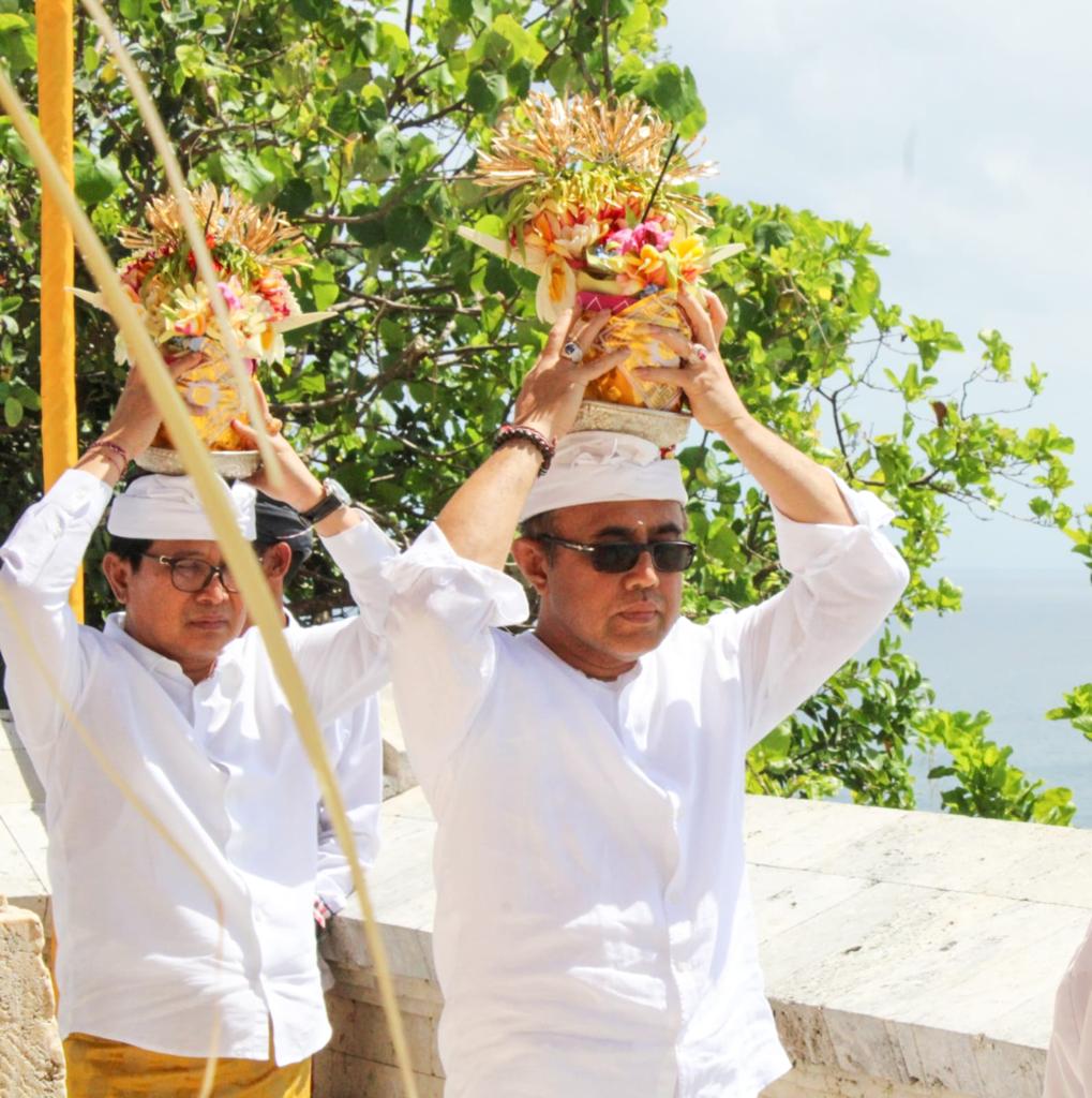 Walikota Denpasar, I Gusti Ngurah Jaya Negara menghadiri Karya Melaspas, Ngenteg dan Tawur Caru Panca Rupa di Pura Luhu Uluwatu, Desa Pecatu, Kabupaten Badung, bertepatan dengan Rahina Sugihan Bali, Jumat (28/7). Upacara tersebut dilaksanakan serangkaian telah rampungnya pengerjaan perbaikan pelinggih di Pura Luhur Uluwatu.