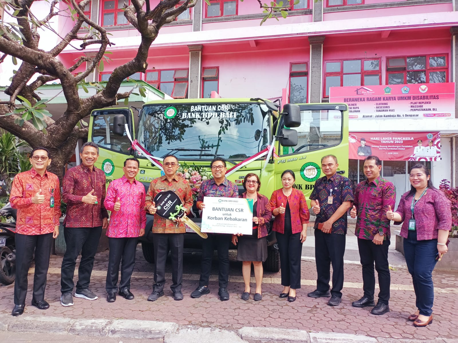 Walikota Denpasar, IGN Jaya Negara menerima bantuan CSR berupa 1 unit truk pengangkut sampah dan 10 unit bantuan bedah rumah kepada korban kebakaran Dusun Wanasari yang diserahkan Direktur Utama (Dirut) Bank BPD Bali, I Nyoman Sudharma di Graha Nawasena Denpasar, Selasa (4/7). Bantuan ini sebagai upaya mendukung program Pemerintah Kota Denpasar , dan juga untuk menunjang pelayanan masyarakat.