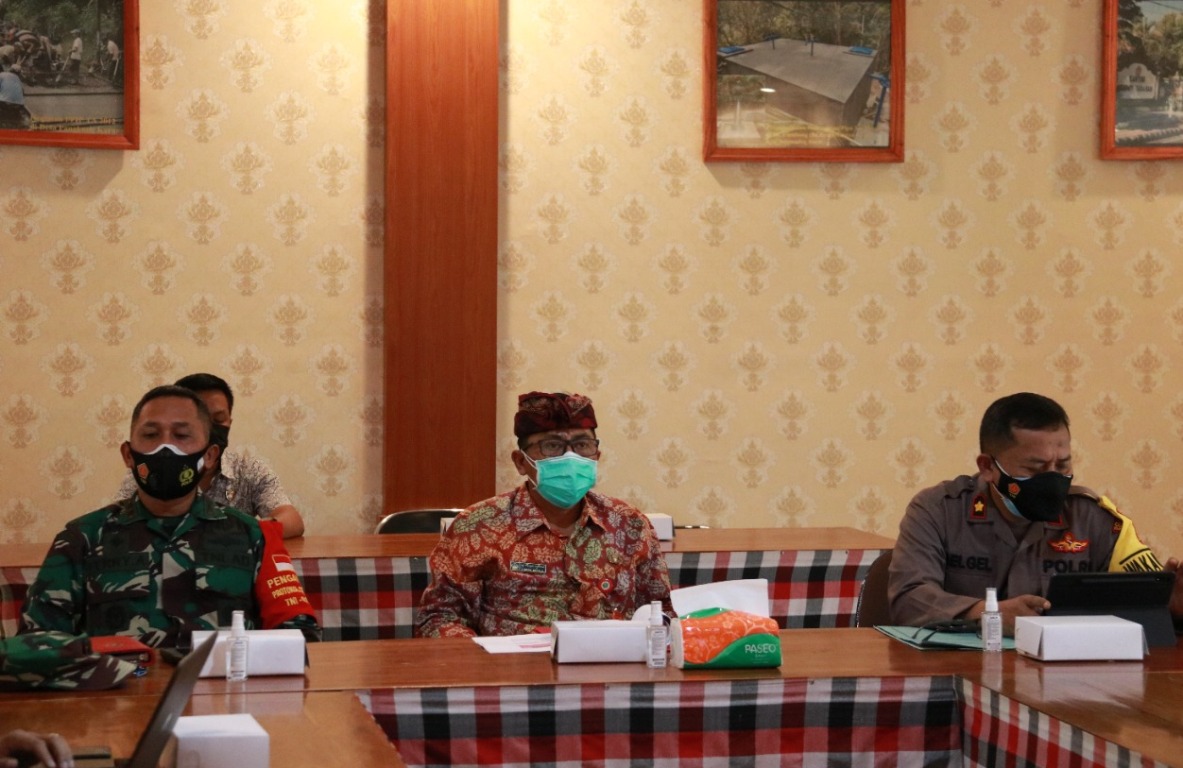 Bupati Tabanan yang dalam hal ini diwakili Sekda I Gede Susila bersama jajaran Forkopimda Tabanan dan OPD terkait, mengikuti Rapat Koordinasi (Rakor) Penanganan Covid-19 yang dipimpin oleh Wakil Presiden RI Ma’ruf Amin, melalui virtual zoom meeting, Kamis, (29/7).