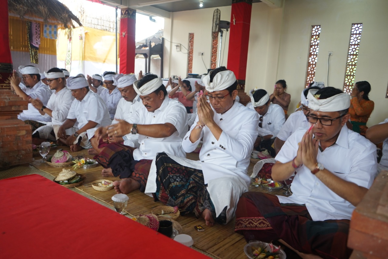 Wakil Walikota I GN Jaya Negara mengikuti persembahyangan bersama pada prosesi upacara Karya Mamungkah , Ngenteg Linggih, Tawur Balik Sumpah Utama dan Pedudusan Agung Nyatur Muka, Kamis (30/1) di Pura Kahyangan Kesambi, Kesiman.