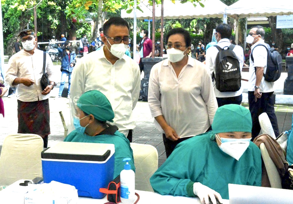 Pemkot Denpasar menggelar vaksinasi Covid-19 masal untuk tenaga kesehatan, yang mana kegiatan ini di Pantau langsung Wakil Walikota Denpasar, IGN. Jaya Negara didampingi Pj. Sekda Kota Denpasar, I Made Toya, Kamis (4/2) di halaman parkir Gedung Graha Sewaka Dharma Lumintang.