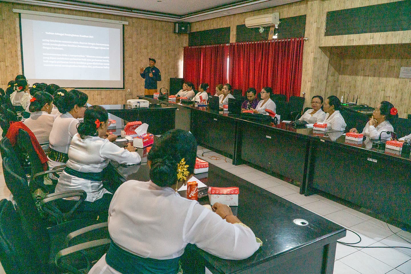 Ketua Wanita Hindu Dharma Indonesia (WHDI) Kabupaten Bangli Ny. Suciati Diar Membuka acara Sosialisasi yang bertemakan Etika Dan Kesadaran Multikultur Dalam Upacara Dan Upakara Yadnya yang dilaksanakan di Ruang Rapat Krisna Setda Bangli pada Selasa, (24/6/25).
