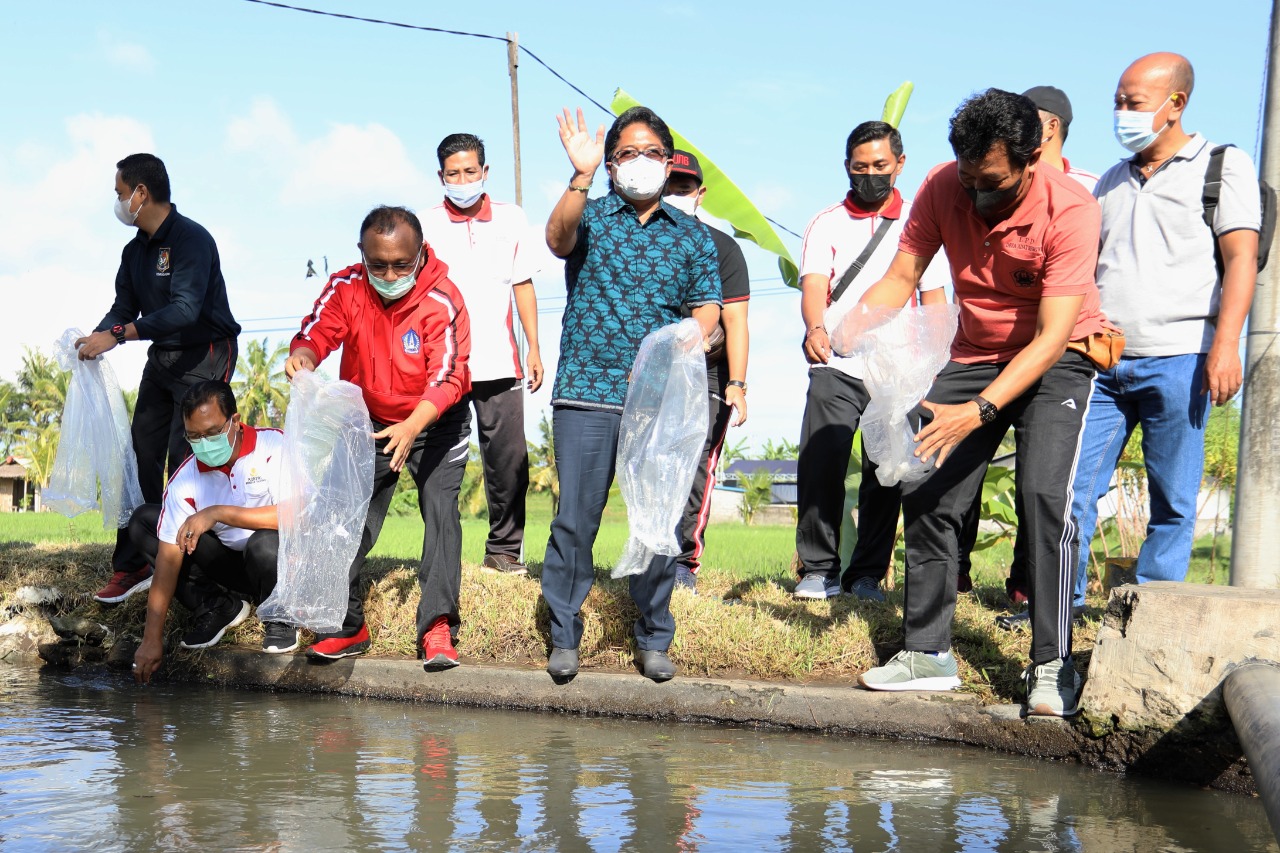 Wujud Implementasi Konsep Merawat Bumi, Bupati Giri Prasta Tebar 50 Ribu Benih Ikan Nila Di Mengwi